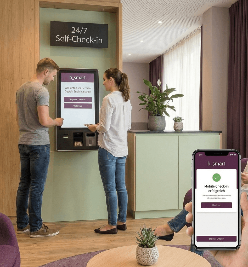 Gäste checken selbstständig online per App oder am Check-in Kiosk ein – 24/7 verfügbar, in mehreren Sprachen, ohne Wartezeit.